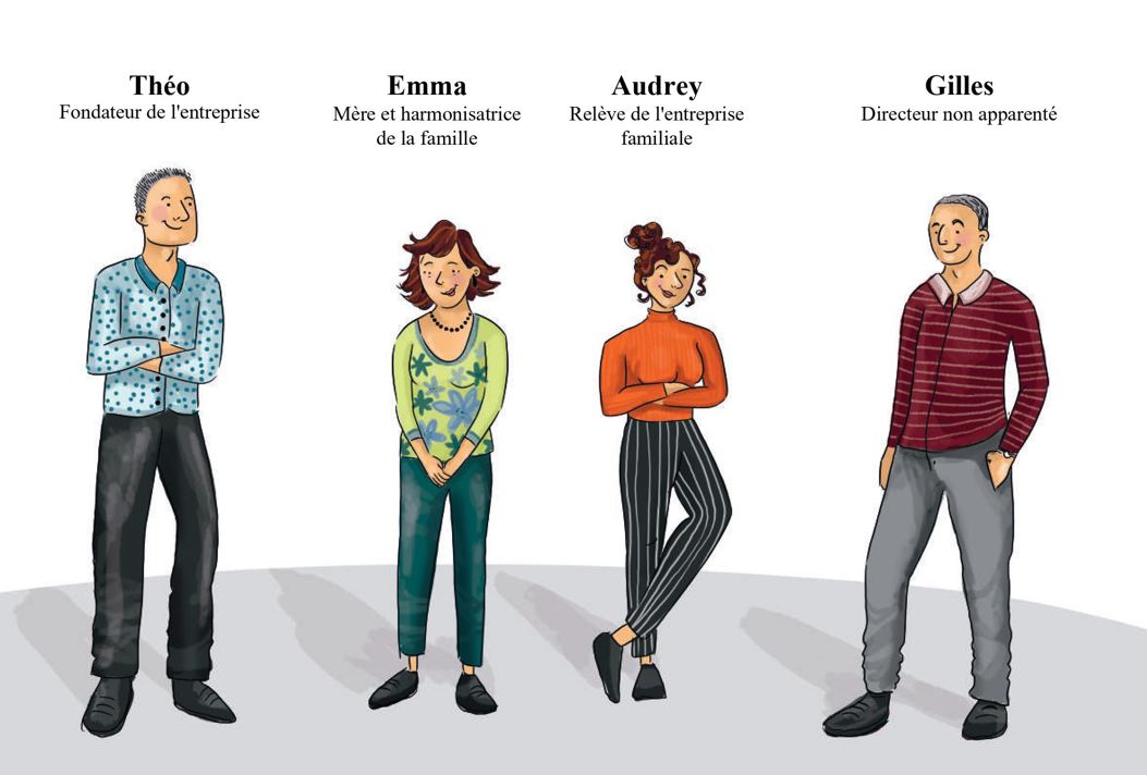 Voici donc Théo, le parent fondateur de l'entreprise, Emma, le parent « harmonisateur », Audrey, la relève de l'entreprise, accompagnée de Gilles, le directeur non apparenté qui est aussi le complice de Théo dans l'entreprise. Tout ce beau monde s'implique à fond dans le fonctionnement d'une entreprise familiale, qu'ils y soient employés ou qu'ils participent à son développement.